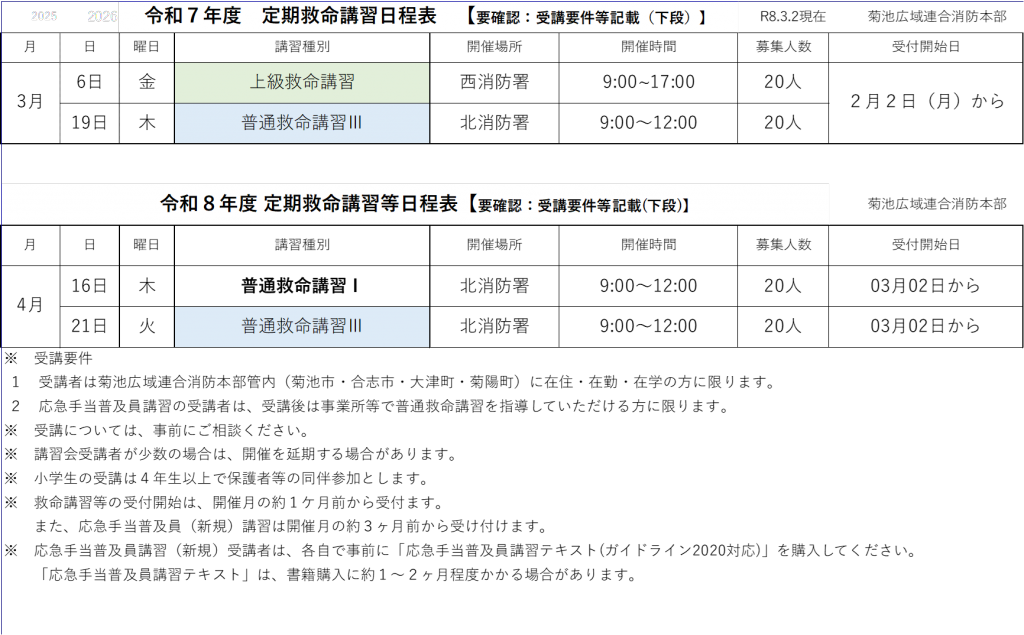 令和7年度(令和7年8月~令和8年3月)・令和8年度(令和8年4月)の定期救命講習日程・開催場所等をお知らせします。