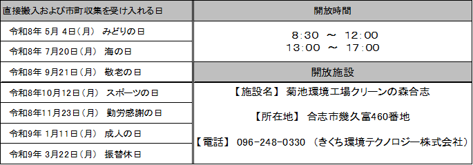 下記の祝日等において、クリーンの森合志(ごみ焼却施設)を開放し、ごみの受け入れを行います。