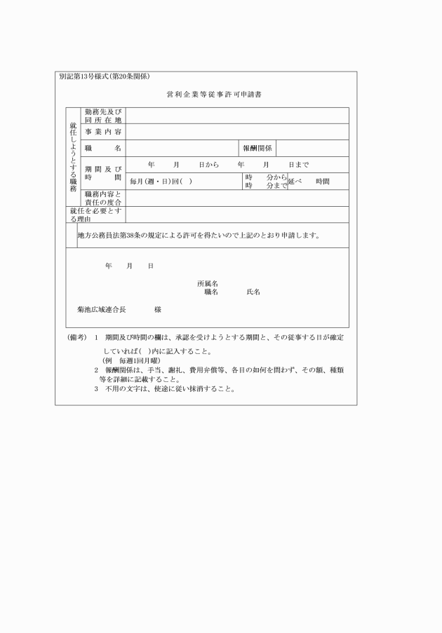 第20条 地方公務員法(昭和25年法律第261号)第38条第1項の規定により営利企業等に従事するための許可を受けようとするときは、あらかじめ営利企業等従事許可申請書(別記第13号様式)に関係書類を添付して、広域連合長に提出しなければならない。