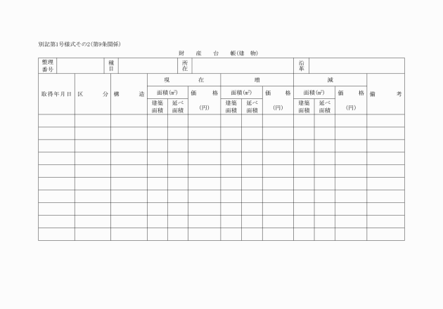 第9条 広域連合長は、広域連合財産(物品を除く。以下本条において同じ。)について、常時、その状況を明らかにするため、その種類及び区分に従い財産台帳(別記第1号様式)を、財産の種類若しくは区分を変更したとき、又は財産にかかる権利の異動があったときは、ただちに、これを整理しなければならない。