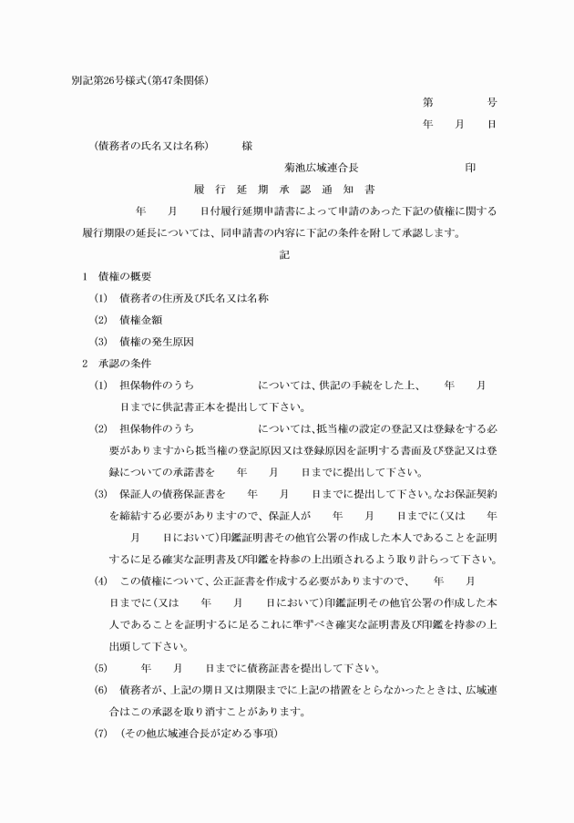 3 履行延期の特約等をする場合は、履行延期承認通知書(別記第26号様式)を作成して債務者に送付するものとする。