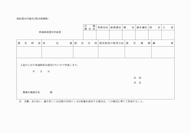 第19条 普通財産の貸付をしようとするときは、その相手方をして、普通財産借受申請書(別記第10号様式)を提出させるものとする。