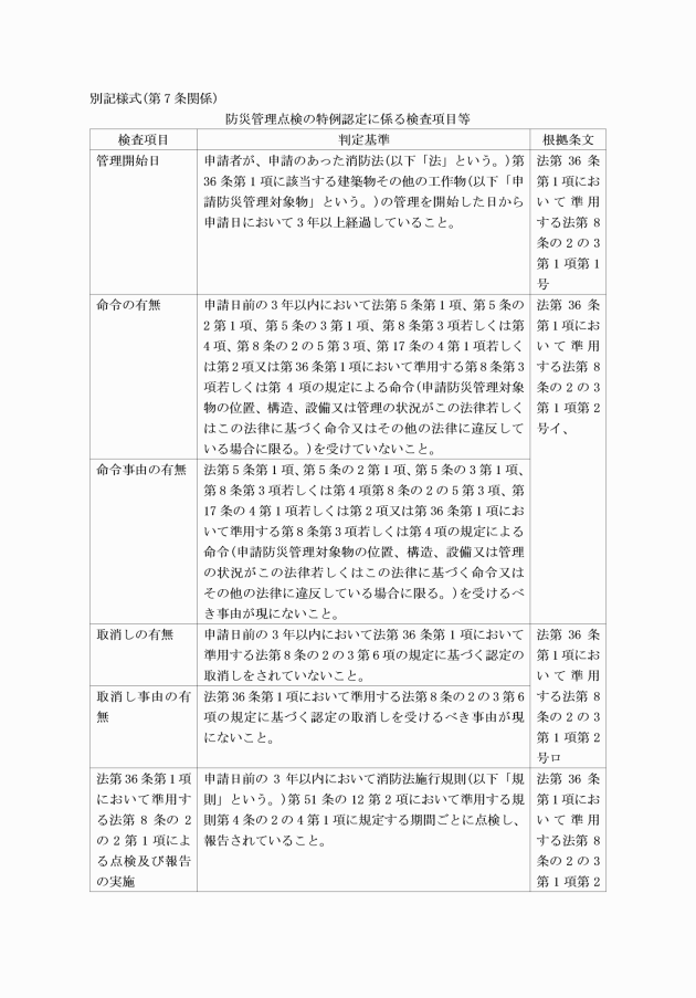 第1条 この要綱は、消防法(昭和23年法律第186号。以下「法」という。)第36条において準用する法第8条の2の3の規定による特例認定について必要な事項を定めるものとする。